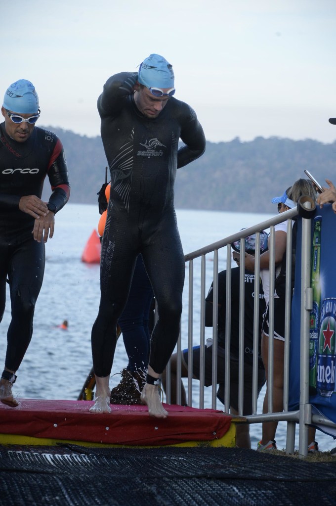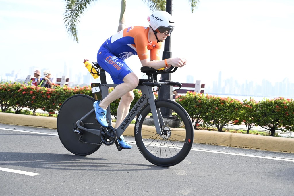 Renntag: 3:00 Uhr morgens Wecker klingelt, Frühstücken das übliche Prozedere eines Triathleten. 4 Uhr machte die Wechselzone auf. Bei diesen Ironman 70.3 gab es keine Wechselbeutel, es war wie der Wald und Wiesen Wettkampf. Alles einfach neben das Rad legen. Genial, das mag ich so. So waren die Radschuhe eingeklickt, die vollen Radflaschen am Rad angebracht und die Laufschuhe, Socken und Mütze für die dritte Disziplin bereitgelegt. Da mein Hotel wie schon erwähnt direkt am Schwimmstart war konnte ich nochmal zurückziehen und ein paar Minuten die Füße hochlegen. 6:30 Uhr Schwimmstart und ohne Vorstartstimmung und etwas Aufgeregtheit geht es nicht. Ein bisschen Spannung muss sein so ging es ca. 45 Minuten vor dem Start in den Startbereich. Das Wasser war mit 21,7 Grad überraschend kalt und somit war der Neo erlaubt. Es wurde Pünktlich gestartet. 6:32 Uhr, durch den Rollingstart, bin ich den Kanal gesprungen. Zwischen ein paar Booten durch die dort lagen und in der Ferne ein Ozeandampfer der gerade in den Panamakanal gefahren ist. Neo plus Salzwasser ist doppelter Auftrieb. Ich freute mich schon auf die guten Schwimmzeit. Mit 25:45 war sie aber erstaunlich gut. Da muss noch etwas Strömung nachgeholfen haben. Aber mit der neuen PB ging es mit einem breiten Grinsen in die lange Wechselzone.