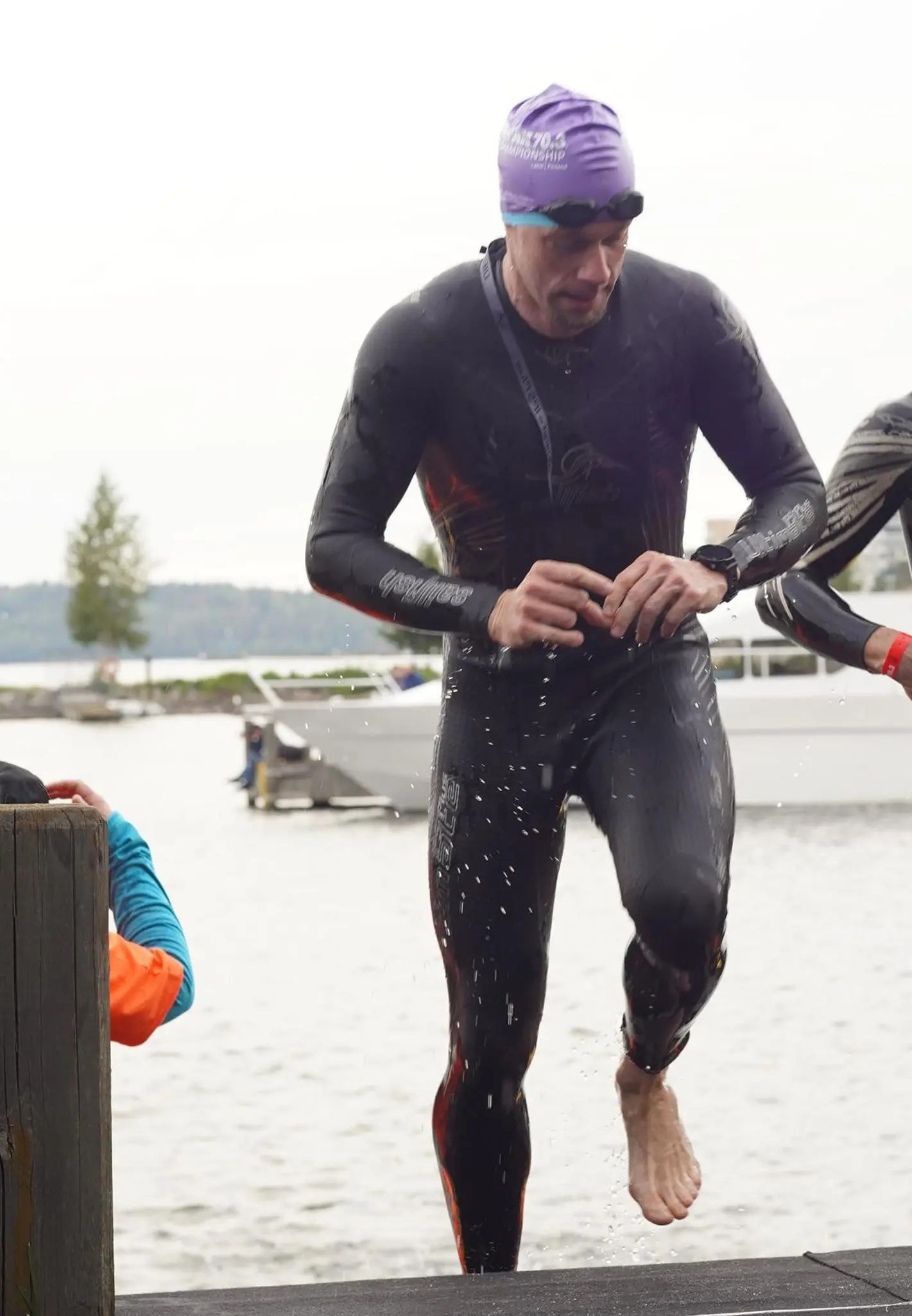 Die Nacht habe ich gut geschlafen. Wir waren dann rechtzeitig in die Stadt gefahren und haben einen guten Parkplatz direkt an der WZ1 bekommen. Das Rad wurde vorbereitet und noch mal der Blick in die Wetter App. Die sagte, immer wieder Schauer möglich und das bei ca. 13-16° Außentemperatur. Meine Altersklasse war diesmal die erste die hinter den Profis starten durfte. Somit war die Wartezeit bis zum Start nicht ganz so lang. NEO an und rein ins getümmel der ca. 550 Starter in meiner AK. Das Wasser hatte 19 Grad. Der Kurs war einfach und die Bojen gut sichtbar, trotzdem hatte ich die ganze Zeit einen linksdrall. Nach soliden knapp 32 Minuten war ich aus dem Wasser. Das scheint wohl die diesjährige Leistung zu sein die ich in der Lage bin zu schwimmen. Beim Wechsel tröpfelte es leicht somit entschied ich mich für Weste und das leichte Stirnband. Lieber ein paar Watt verlieren als unnötigt Power beim Frieren.